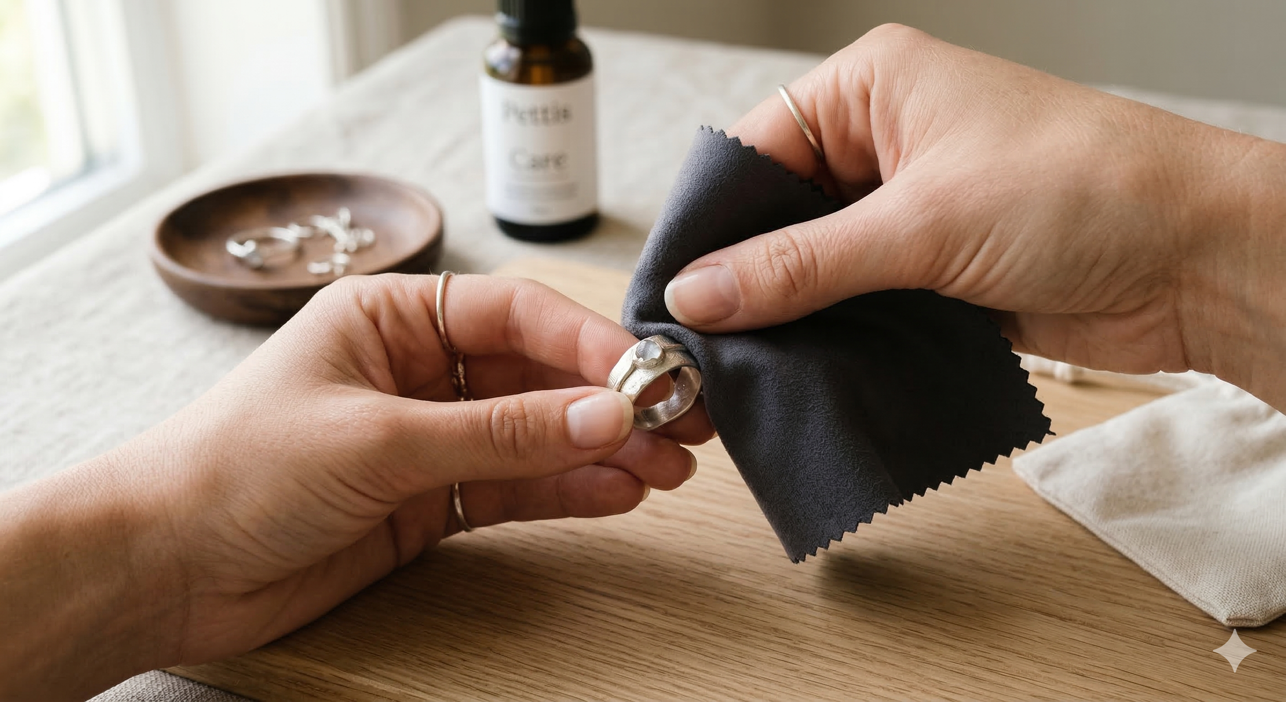 Plata y Oro: Utiliza un paño de algodón suave y seco (una gamuza de joyería es ideal). Si es necesario, puedes usar agua tibia y un jabón neutro, frotando con mucha suavidad y asegurándote de secar la pieza por completo antes de guardarla.
